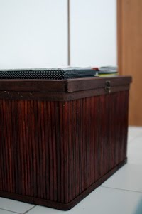 Baú que comprei na Etna para guardar o aspirador de pó que ficava muito feio mesmo dentro da caixinha.